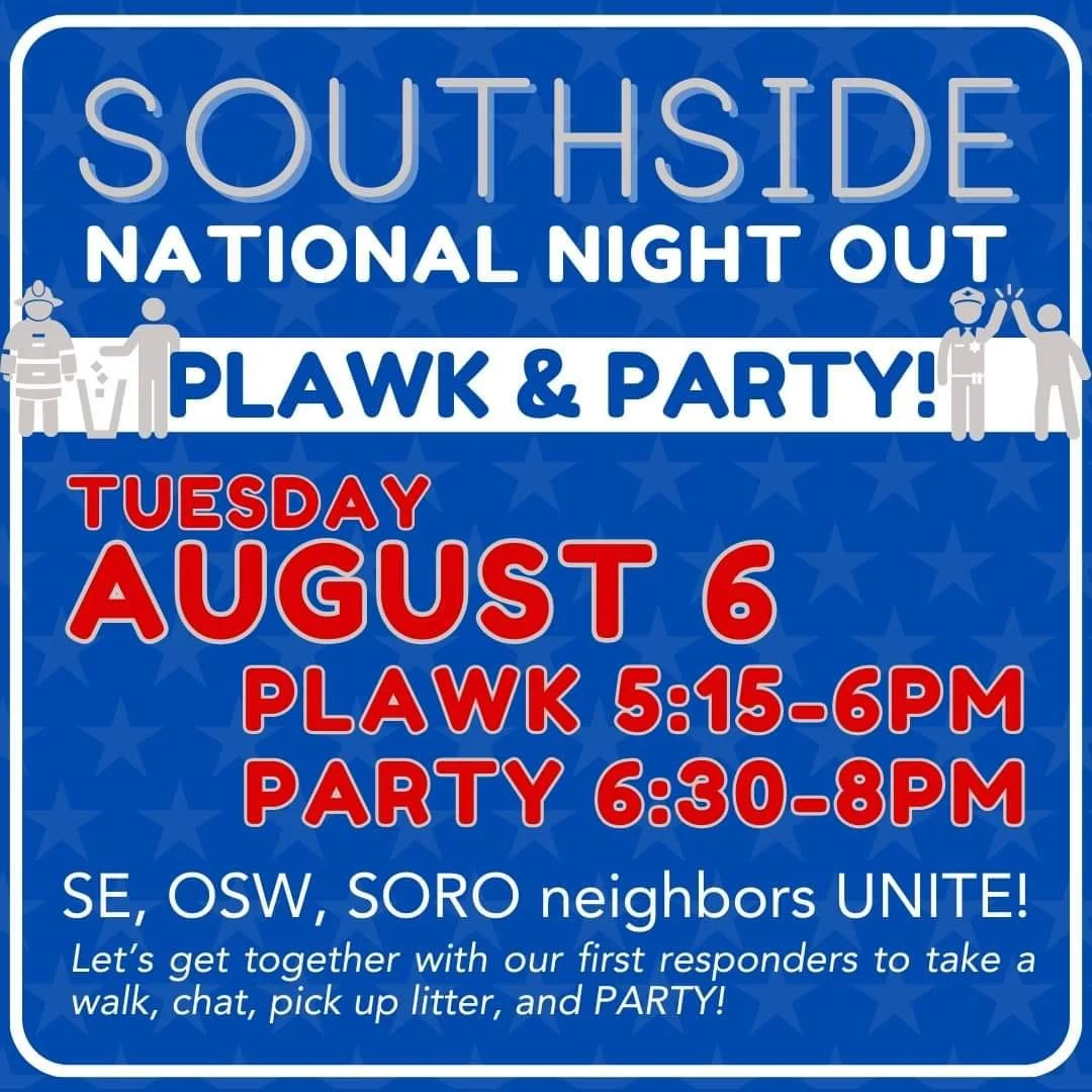 SE + OSW + SoRo neighbors UNITE! Let’s get together with our first responders to take a walk, chat, pick up litter, and PARTY for National Night Out!